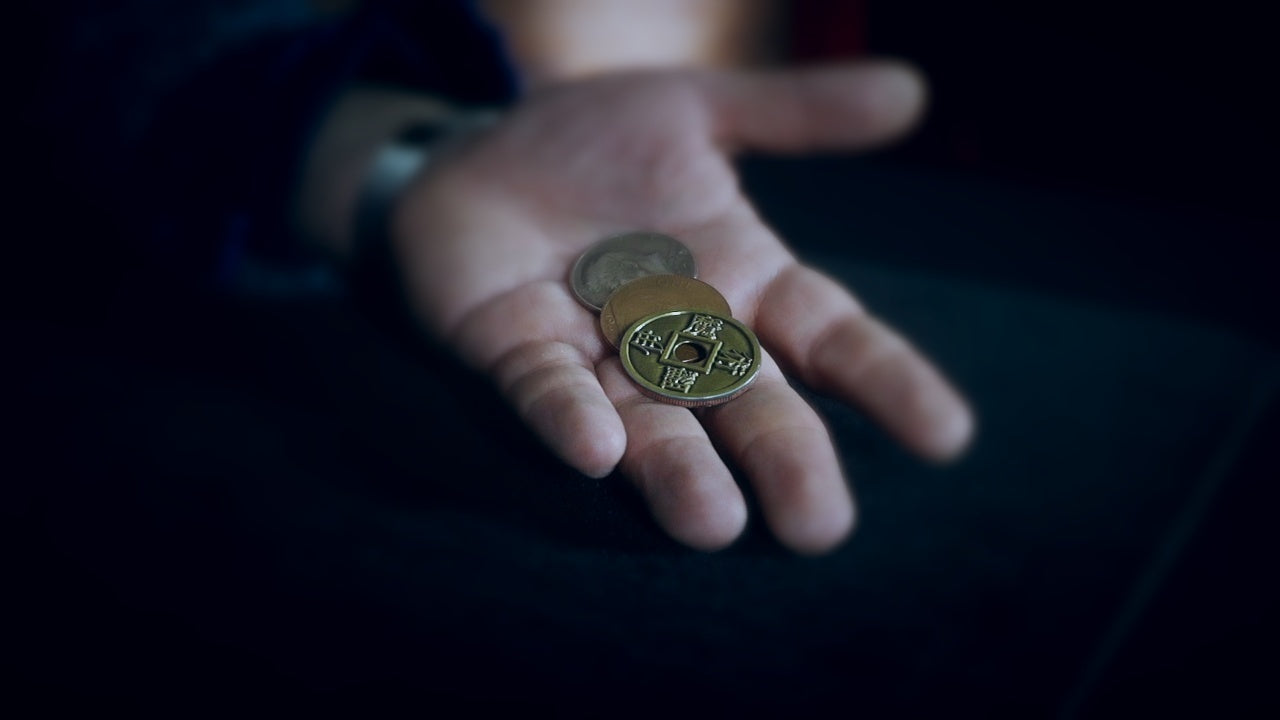 In this powerhouse coin routine, the performer uses three distinct coins: a brass coin with a hole in the center, a copper coin, and a half-dollar. First, in an ultra-clean transposition, the silver coin switches places with the copper and brass coins in the magician's otherwise-empty hands. Next, the transposition happens in the spectator's hand. When the magician places a coin away, it jumps back into their hand. With a squeeze, the copper and brass coins vanish, leaving the magician with just the half dollar. Finally, the half dollar vanishes completely - both hands are seen completely empty with no sleeves.